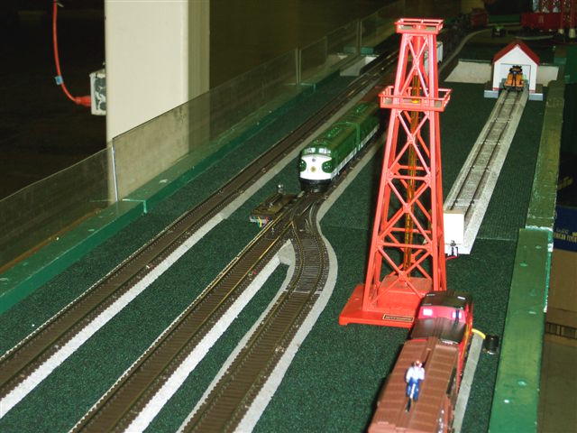 Track Laying Stage, overall layout measures 22' X 13' Pictures Courtesy of John Sullivan building his S-Gauge Layout Pictures Courtesy of Michael & Linda Marmer adding Buildings, Crossing Gates, Scenery and Telegraph Poles on There D&K RR Layout. Pictures of Don Stratton's S-Gauge Layout in Track Laying Stage Pictures Courtesy of Michael & Linda Marmer Ballasting Track on There D&K RR Layout. Pictures Courtesy of Tom Robinson's Volunteer Central II Train Layout with under the table mounted ( Circutron ) Tortoise slow motion switch machines operating S-54 Switches. ![]() ![]() ![]() ![]() ![]() ![]() Pictures Courtesy Tom Robinson - Atlantic Coast S Gaugers Georgia Division Modular Layout, September 15 & 16, 2007 3rd Annual Ride the Rails Festival at Mineral Bluff, GA ![]() ![]() ![]() ![]() ![]() The 8 X 8 permanet display layout was built by Bill Odendahl ![]() A beautiful custom painted AF Northern by Jim Dunn. It is modeled after some of the custom painted models that reportedly ran at the Gilbert Hall of Science. ![]() ![]() Pictures Courtesy Tom Robinson - Atlantic Coast S Gaugers Georgia Division Modular Layout, August 11, 2007 Railroadiana Show at the Atlanta Trade Center ![]() ![]() ![]() ![]() ![]() ![]() Pictures and Text Courtesy of Tom Robinson's, "The Volunteer Central II" S-Gauge Layout. I started this layout in 2002 and completed it in early 2005. It is a 15 by 16 ft layout with approx. 350 ft of American S Gauge flex track mounted on 1/4" Vinylbed roadbed. It has four mainlines on two tiers with 23 Flyer 720A turnouts and 22 706 uncouplers. It also includes a Bowser 22" turntable and six stall roundhouse area. It is fully sceniced with mountains, river, groundcover, etc. Two sides are bordered with a backdrop. The layout includes almost all of the trains and accessories, of the Am Flyer link coupler era (1946-54), plus a few of the later ones such as Cow-on-Track, Sawmill, Drum Loader and repro Gabe. Also included are approx 25 Plasticville structures forming a town, approx 30 Lehigh Valley Model S Gauge structure kits and other structures. It is powered by 8 American Flyer 12B, 8B, and 9B transformers with a total output of 1150 watts. All controls are original Am Flyer. It has quite a few animated signs, operating traffic lights and other electronic lighting effects (hobo campfire, simulated arc welders, etc.). It has approximately 5,000 ft of wiring with all transformers phased and wired to a common ground. All tracks are interconnected with semaphore control on three of the main lines using Flyer semaphores with 670 electric track trips. ![]() ![]() ![]() ![]() ![]() ![]() ![]() ![]() Tom Robinson extra layout